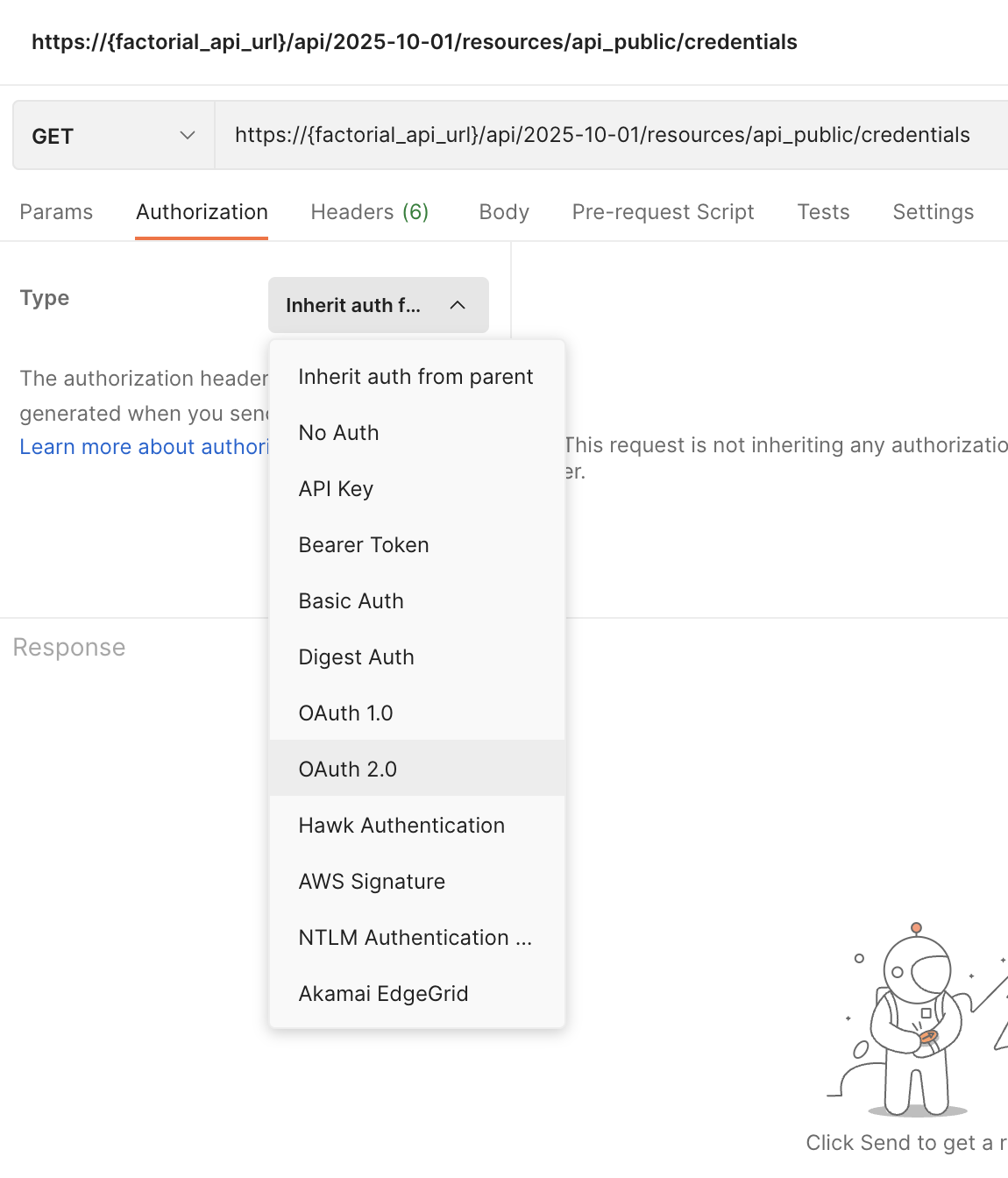 - Go to your Postman account > paste the Factorial credentials endpoint URL > select Authorization > OAuth 2.0